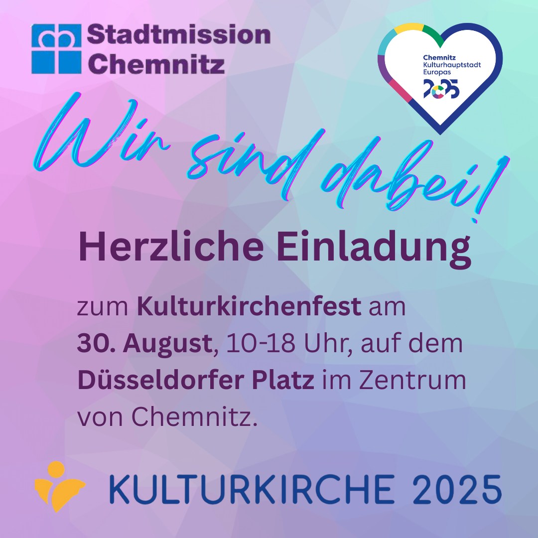 Einen festlichen Höhepunkt des Kulturhauptstadtjahres 2025 feiern wir mit Chemnitzer:innen und Gästen aus aller Welt beim Chemnitzer Kulturkirchenfest am Samstag, 30.08., ab 10 Uhr auf dem Düsseldorfer Platz. Seien auch Sie dabei und entdecken Sie das ganze Spektrum unserer Dienstleistungen, Angebote und Mitarbeiter:innen im fröhlichen Rahmen eines großen, bunten Festes in der Chemnitzer Innenstadt.